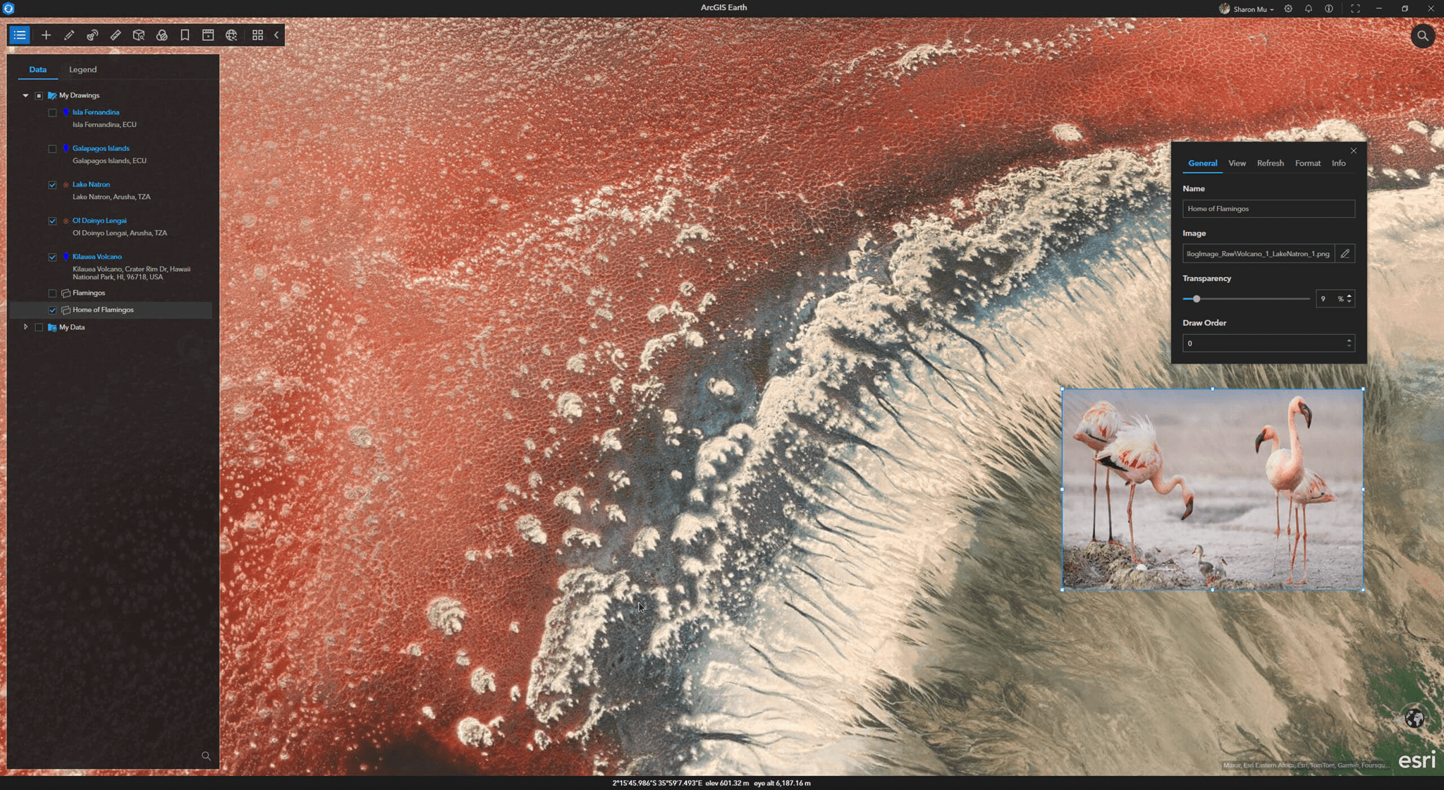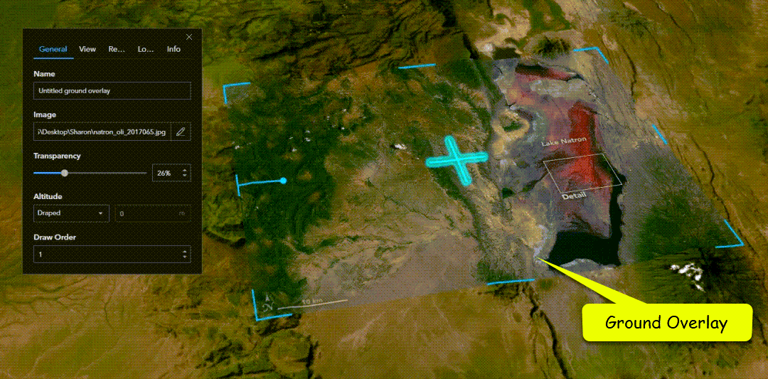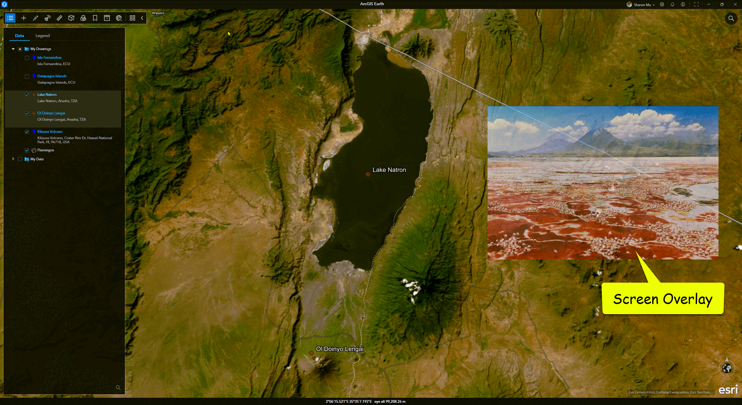 The volcano’s crater and surface patterns are distinctly visible on a 3D map. To the north, you can locate Lake Natron. By inserting a screen overlay, the map becomes more vivid and engaging.