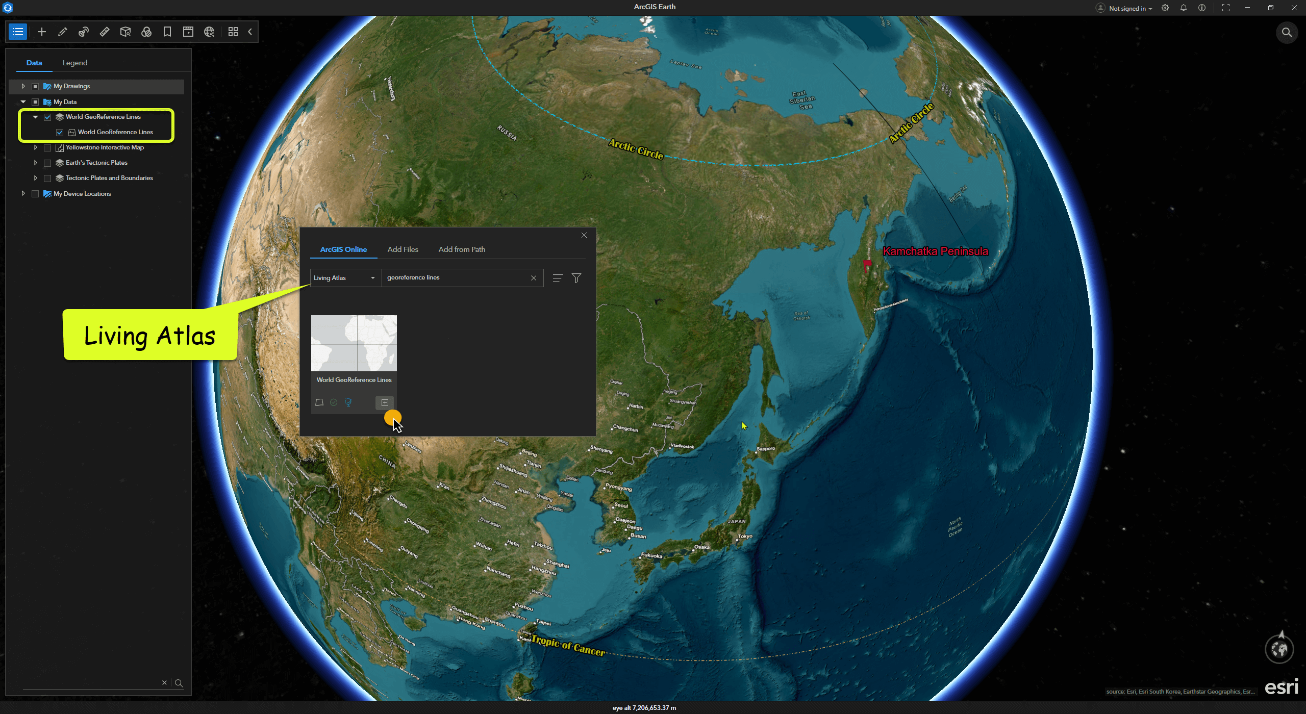 In ArcGIS Earth, add the World Georeference Lines layer from Living Atlas to observe the Kamchatka Peninsula’s location near the Arctic Circle.