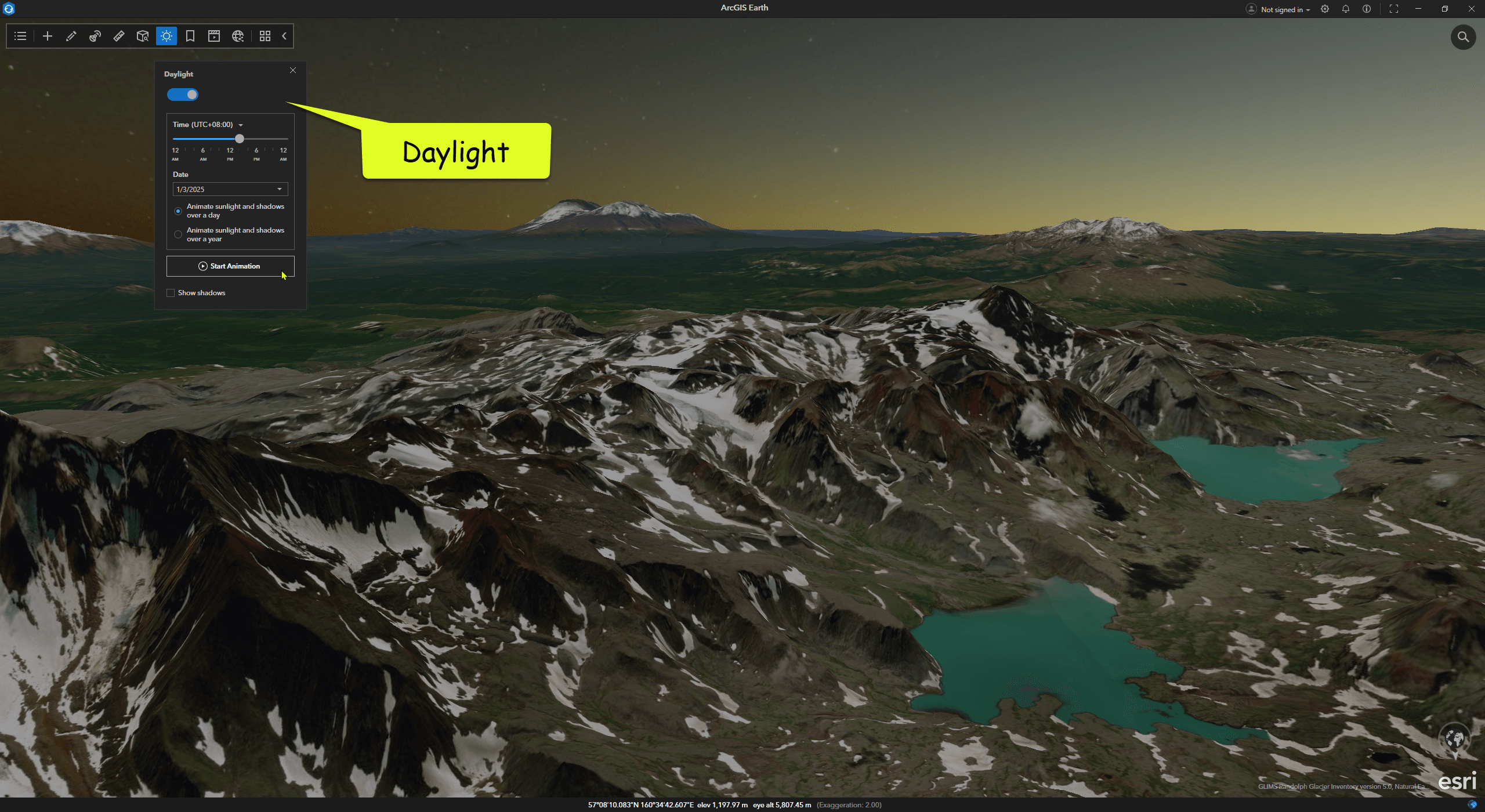Open the Real-World Time Simulator “Daylight” in ArcGIS Earth to experience the transitions of day, night, and the galaxy of stars.