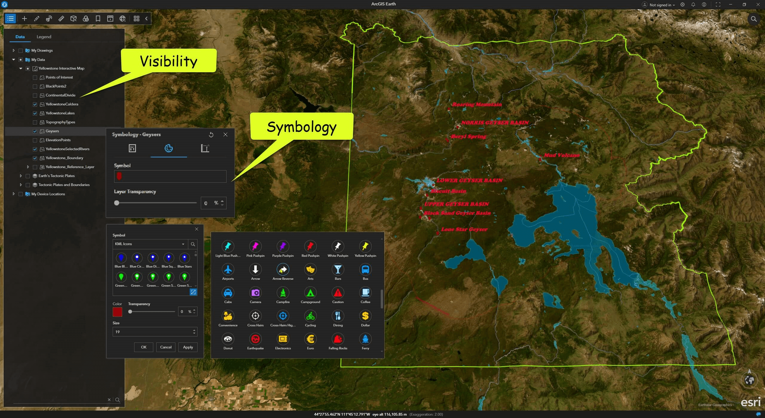 ArcGIS Online and Living Atlas offer a wealth of global open geographic data. These resources can be easily accessed in ArcGIS Earth. Click “Add Data” from the toolbar and search for Yellowstone to find many related datasets.