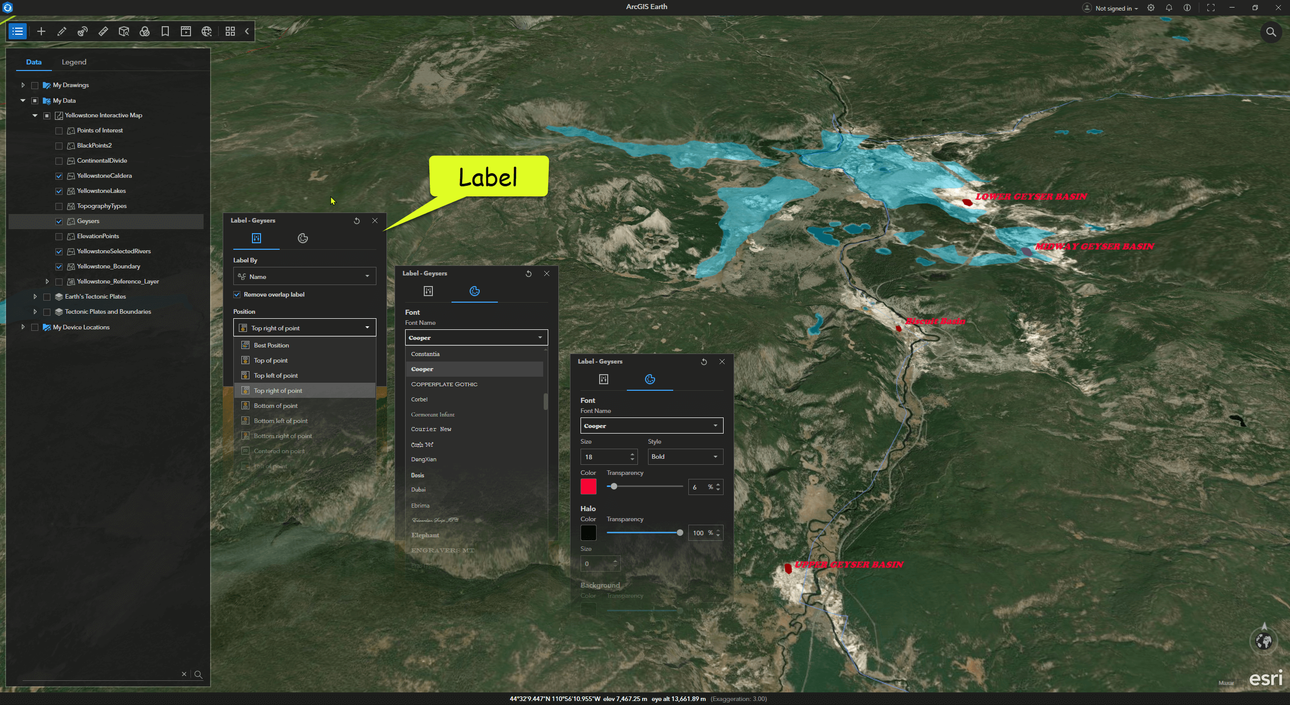 This dataset includes a geyser layer. Modify the symbols and labels to highlight it, and keep only the necessary data layers by unchecking the rest.